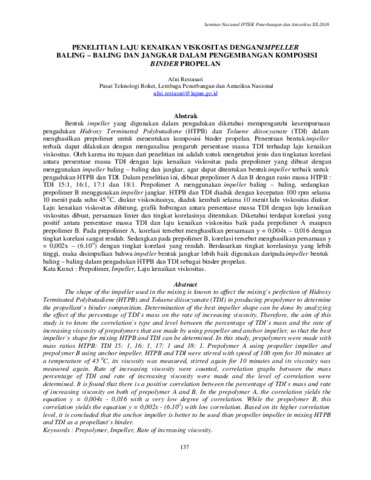 Afni Restasari (2016) Penelitian Laju Kenaikan Viskositas dengan Impller Baling-Baling dan Jangkar dalam Pengembangan Komposisi Binder Propelan. Prosiding SIPTEKGAN XX-2016 Seminar Nasional IPTEK Penerbangan dan Antariksa XX Tahun 2016. pp. 137-145.