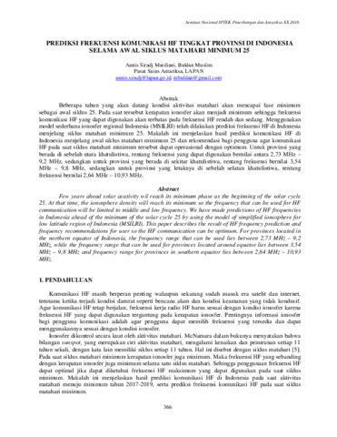 Annis Siradj Mardiani and Buldan Muslim (2016) Prediksi Frekuensi Komunikasi HF Tingkat Provinsi Di Indonesia Selama Awal Siklus Matahari Minimum 25. PROSIDING SIPTEKGAN XX-2016 Seminar Nasional IPTEK Penerbangan dan Antariksa XX Tahun 2016. pp. 366-374. ISSN 978-602-71833-2-2
