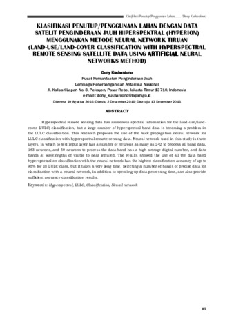 | Uncontrolled Keywords: | Hiperspektral, LULC, Klasifikasi, Neural network |
