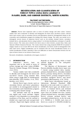 Heru Noviar and Tatik Kartika (2016) Identification and Classification of Forest Types using Data Landsat 8 in Karo, Dairi, and Samosir Districts, North Sumatra. International Journal of Remote Sensing and Earth Sciences, 13 (2). pp. 139-150. ISSN 0216-6739