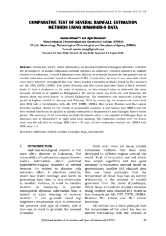 Indonesian society needs information on potential hydrometeorological disasters, therefore the development of rainfall estimation methods becomes an important research activities to support disaster risk reduction. Central Kalimantan were selected as research location for comparative test of rainfall estimation methods based on Himawari-8 IR1 (11µm) data, because it has area with cloud cover fairly intensive throughout the year. Some rainfall estimation methods tested in this research are AE, CST, CSTM, IMSRA. Non Linear Relation, and Non Linear Inversion. Each of these methods tends to have a weakness in the value of accuracy, so this research aims to determine the most accurate method to be applied in Palangkaraya (27 meters above sea level) city and Muratewe (60 meters above sea level) district in Central Kalimantan. The experiment was conducted during the period of highest rainfall in January and February 2016 by converting the temperature data cloud tops (IR1) into a precipitation with AE, CST, CSTM, IMSRA, Non Linear Relation and Non Linear Inversion method. Based on the results of quantitative analysis, it was known that IMSRA was the best method which can be applied in rainfall estimation in Muarateweh’s and Palangka Raya’s winter period. The Accuracy of all estimation methods decreased when it was applied in Palangka Raya at afternoon and in Muarateweh at night until early morning. The estimation method with the lowest score was the AE with an average MSE value > 90 and the best estimation method was IMSRA with MSE value <12.