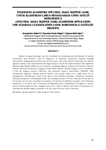 Nunung Noer Aziizah and Vincentius Paulus Siregar and Syamsul Bahri Agus (2016) Penerapan Algoritma Spectral Angle Mapper (SAM) Untuk Klasifikasi Lamun Menggunakan Citra Satelit Worldview-2. Jurnal Penginderaan Jauh dan Pengolahan Data Citra Digital, 13 (2). pp. 61-72. ISSN 1412-8098