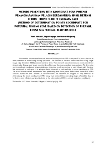 Informasi titik koordinat zona potensi penangkapan ikan (ZPPI) sangat diperlukan oleh pengguna agar lebih efektif dalam melakukan operasi penangkapan ikan. Hasil deteksi termal front menggunakan metode Single Image Edge Detection (SIED) dalam bentuk garis kontur. Penelitian ini bertujuan untuk menentukan titik koordinat ZPPI berdasarkan hasil deteksi termal front suhu permukaan laut. Untuk menentukan titik koordinat dilakukan segmentasi hasil deteksi sesuai ukuran fishnet grid. Garis kontur yang terdapat dalam setiap grid merupakan bentuk poligon. Pusat geometri dari setiap poligon merupakan titik koordinat ZPPI. Hasil pengolahan data suhu permukaan laut dari satelit Terra/Aqua MODIS dan Suomi NPP VIIRS menunjukkan bahwa metode penentuan pusat geometri poligon sangat efektif dalam menentukan titik koordinat ZPPI. Dengan menggunakan metode tersebut tahap pengolahan data satelit menjadi lebih cepat, efisien dan lebih praktis karena informasi ZPPI sudah dalam bentuk titik koordinat