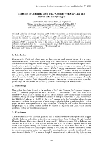 Xiao Wei Shu and Rika Suwana Budi and Liu Feng Gouw (2016) Synthesis of Uniformly Sized Cu2O Crystals with Star-Like and Flower-Like Morphologies. Proceedings International Seminar on Aerospace Science and Technology (ISAST) 2016. pp. 129-132.