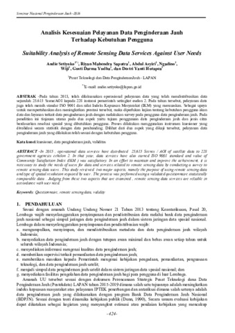 Pada tahun 2015, telah dilaksanakan operasional pelayanan data yang telah mendistribusikan data sejumlah 25.615 Scene/AOI kepada 228 instansi pemerintah setingkat eselon 2. Pada tahun tersebut, pelayanan data juga telah meraih standar ISO 9001 dan nilai Indeks Kepuasan Masyarakat (IKM) yang memuaskan. Sebagai upaya untuk mempertahankan dan meningkatkan prestasi tersebut, maka diperlukan kajian tentang kebutuhan pengguna akan data dan layanan terkait data penginderaan jauh dengan melakukan survey pada pengguna data penginderaan jauh. Pada penelitian ini tinjauan utama pada dua aspek yaitu tujuan penggunaan data penginderaan jauh dan jenis citra berdasarkan resolusi spasial yang dibutuhkan pengguna. Proses dilakukan menggunakan instrumen kuesioner yang divalidasi secara statistik dengan data pembanding. Dilihat dari dua aspek yang dikaji tersebut, pelayanan data penginderaan jauh yang dilakukan telah sesuai dengan kebutuhan pengguna.