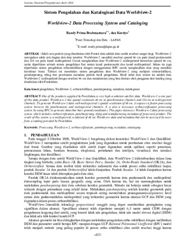 Salah satu produk yang disediakan oleh Pustek data adalah data satelit resolusi sangat tingi. Worldview-2 merupakan salah satu bagian dari data tersebut. Worldview-2 memiliki resolusi spasial 46 cm pada kanal pankromatik dan 184 cm pada kanal multispektral. Untuk menghasilkan data Worldview-2 multispektral beresolusi spasial 46 cm, maka diperlukan sebuah sistem pengolahan fusi antara kanal pankromatik dan kanal multispektral. Selain itu juga diperlukan sistem pengolahan orthorektifikasi dengan menggunakan RPC untuk menghasilkan data yang memiliki koordinat bumi. Tulisan ini membahas sistem pengolahan data Worldview-2 yang meliputi orthorektifikasi, pansharpening, tiling dan pembuatan metadata produk hasil pengolahan. Hasil akhir dari sistem ini adalah data Worldview-2 multispektral dengan resolusi 46 cm dan metadatanya yang bisa diakses oleh pengguna dari katalog yang disediakan oleh Pustekdata.