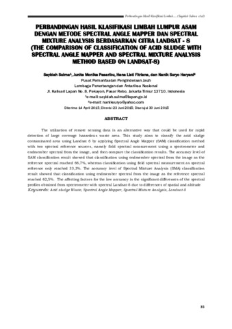 Pemanfaatan data penginderaan jauh merupakan salah satu alternatif yang dapat digunakan untuk deteksi daerah tercemar limbah B3 secara cepat dengan wilayah yang luas. Penelitian ini bertujuan untuk mengklasifikasi daerah tercemar lumpur asam menggunakan data Landsat 8 dengan metode Spectral Angle Mapper (SAM), kemudian membandingkan hasil klasifikasi SAM menggunakan spektral referensi berdasarkan pengukuran spektrometer dengan spektral yang diperoleh dari endmember citra. Tingkat akurasi klasifikasi SAM dengan spektral referensi berdasarkan endmember citra adalah sebesar 66,7 %, sedangkan dengan menggunakan referensi spektrometer hanya mencapai 33,3 %. Tingkat akurasi klasifikasi Spectral Mixture Analysis (SMA) dengan spektral referensi berdasarkan endmember citra adalah sebesar 62,5 %. Faktor yang mempengaruhi rendahnya akurasi adalah perbedaan yang signifikan antara profil spektral yang diperoleh dari spektrometer dengan spektral Landsat-8 akibat perbedaan spasial dan ketinggian