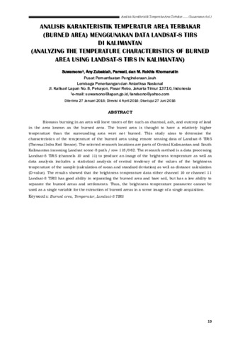 Suwarsono and Any Zubaidah and Parwati and M. Rokhis Khomarudin (2016) Analisis Karakteristik Temperatur Area Terbakar (Burned Area) Menggunakan Data Landsat-8 TIRS di Kalimantan. Jurnal Penginderaan Jauh dan Pengolahan Data Citra Digital, 13 (1). pp. 13-22. ISSN 1412-8098