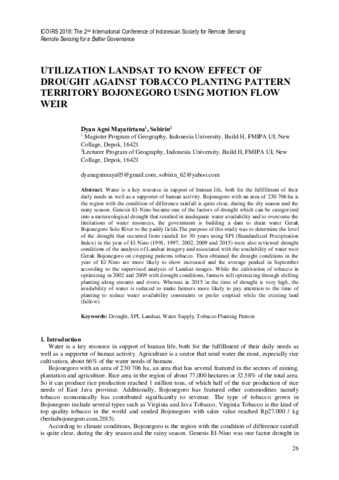 Dyan Agni Mayatirtana and Sobirin (2016) Utilization Landsat to know Effect of Drought Against Tobacco Planting Pattern Territory Bojonegoro using Motion Flow Weir. Proceedings The 2nd International Conference of Indonesian Society for Remote Sensing 2016, 47. pp. 26-34.
