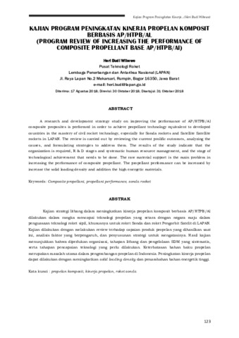 Kajian strategi litbang dalam meningkatkan kinerja propelan komposit berbasis AP/HTPB/Al dilakukan dalam rangka mencapai teknologi propelan yang setara dengan negara maju dalam penguasaan teknologi roket sipil, khususnya untuk roket Sonda dan roket Pengorbit Satelit di LAPAN. Kajian dilakukan dengan melakukan review terhadap capaian produk propelan yang dihasilkan saat ini, analisis faktor yang berpengaruh, dan penyusunan strategi untuk mengatasinya. Hasil kajian menunjukkan bahwa diperlukan organisasi, tahapan litbang dan pengelolaan SDM yang sistematis, serta tahapan pencapaian teknologi yang perlu dilakukan. Keterbatasan bahan baku propelan merupakan masalah utama dalam pengembangan propelan di Indonesia. Peningkatan kinerja propelan dapat dilakukan dengan meningkatkan solid loading density dan penambahan bahan energetik tinggi.