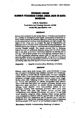Lilik S. Supriatin (2016) Estimasi lokasi Sumber Pencemar Udara Jarak jauh di Kota Bandung. In: Sains dan Teknologi Atmosfer Benua Maritim Indonesia. CV.Media Akselerasi, Bandung, pp. 49-61. ISBN 978-602-6465-04-7