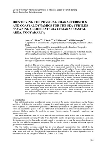 Sunarto and I Elvira and I P Nastiti and M N Malawani and M H D Sasongko (2016) Identifying the Physical Characteristics and Coastal Dynamics for the Sea Turtles Spawning Ground at Goa Cemara Coastal Area, Yogyakarta. Proceedings The 2nd International Conference of Indonesian Society for Remote Sensing 2016, 47. pp. 204-211.