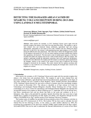 After inactive for centuries, in 2013 Sinabung Volcano active again with the enormity eruption that release a hot cloud, lava and pyroclastic flows. The eruption is said to have claimed lives and destroyed human settlements, agricultural land and existing infrastructure, particularly on the slopes of the south, southeast and east. During the period from 2013 to mid 2016, this volcano is still experiencing some major eruption, so it is possible having the affected area more extensively. This study aims to detect the damaged areas caused by the eruption in the period 2013 to 2016 by using a medium resolution satellite data, Landsat latest generation, the Landsat-8. The data used is a pair of multitemporal imagery, ie the first is recorded data before the eruption and second is data recorded during or after the eruption. The method is performed include the radiometric correction, land cover supervised classification, detection the areas affected by the eruption and GIS analysis to determine spatial-quantitatively the damages, namely in the context of the extents of each type of landcover that having damaged or destroyed by the eruption. The results showed that the medium resolution data Landsat-8 is very useful for use in detecting and mapping the damaged areas caused by the eruption of a volcano