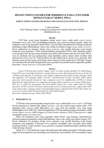 A. Hadi Syafrudin (2017) Desain Timing Generator Sederhana Pada CCD Linier Menggunakan Modul FPGA. Prosiding SIPTEKGAN XXI-2017 Seminar Nasional Iptek Penerbangan & Antariksa XXI Tahun 2017. pp. 198-205. ISSN 978-602-71833-3-9