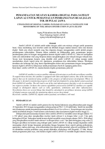 Agung Wahyudiono and Rosza Madina (2017) Pemanfaatan Muatan Kamera Digital Pada Satelit LAPAN A2 Untuk Pemantauan Pembangunan Ruas Jalan Tol Di Pulau Jawa Utilization Of Digital Camera Payload On LAPAN A2 Satellite For Monitoring Of Toll Road Construction In Java Island. Prosiding SIPTEKGAN XXI-2017 Seminar Nasional Iptek Penerbangan & Antariksa XXI Tahun 2017. pp. 242-249. ISSN 978-602-71833-3-9