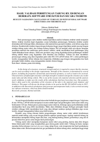 Pada perancangan suatu struktur mutlak diperlukan analisis kekuatan struktur untuk menjamin bahwa struktur tersebut dapat digunakan sesuai kebutuhan perancangan. Kekuatan struktur sendiri ditentukan oleh beberapa faktor, diantaranya sifat material dan geometri struktur, serta beban yang akan diterima. Karakteristik struktur ringan dengan kekuatan tinggi sangat diperlukan untuk rancang bangun struktur tabung motor roket, dan wahana terbang lainnya. Hal ini menjadi salah satu alasan mengapa pemilihan material dan analisisnya perlu adanya validasi, untuk meyakinkan hasil perhitungan yang sudah dilakukan benar adanya. Salah satu geometri yang sering digunakan dalam perhitungan struktur tabung adalah bahan yang digunakan serta diameter dan tebalnya. Tulisan ini akan membahas perancangan tabung yang akan digunakan pada roket RX 320 LAPAN tahun 2017, selain perhitungan teoritis menggunakan beban tekanan dan temperatur, dilakukan juga dengan menggunakan dua buah perangkat lunak struktur, yang menggunakan metode elemen hingga.