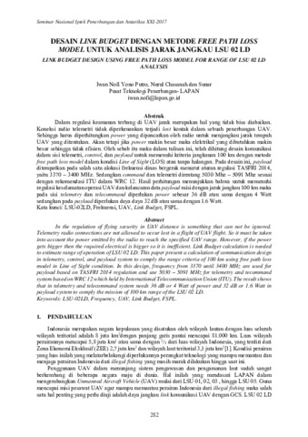 Iwan Nofi Yono Putro and Nurul Chasanah and Sunar (2017) Desain Link Budget Dengan Metode Free Path Loss Model Untuk Analisis Jarak Jangkau LSU 02 LD. Prosiding SIPTEKGAN XXI-2017 Seminar Nasional Iptek Penerbangan & Antariksa XXI Tahun 2017. pp. 282-288. ISSN 978-602-71833-3-9
