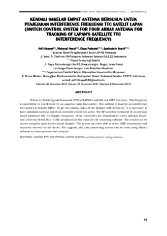Telemetry Tracking And Command (TTC) satelit LAPAN menggunakan frekuensi UHF. Frekuensi UHF rentan terhadap interference. Salah satu metode mencari pemancar interference menggunakan metode efek Doppler. Untuk mendapat nilai pergeseran frekuensi sesuai efek Doppler yang dibutuhkan, diperlukan sakelar antena yang stabil, yang berfungsi sebagai pengontrol antena array. Rangkaian sakelar RF di kontrol dengan Arduino board menghasilkan Doppler frekuensi 500 Hz. Demodulator, clock Arduino Board dan Soundcard sebagai input software pencari. Hasil outputnya dapat dilihat dengan menggunakan software open akses sounDoppler. Sistem ini mampu mendeteksi pemancar maupun repeater yang diterima oleh perangkat. Upgrade sistem dari penelitian ini adalah proses pengolahan data dapat dilakukan secara mandiri menggunakan software Matlab sehingga lebih mudah untuk diolah dan dianalisis.