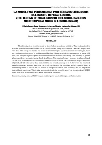 Uji model adalah sebuah tahapan yang harus dilakukan sebelum model tersebut digunakan untuk kegiatan yang bersifat operasional. Penelitian ini bertujuan untuk menguji akurasi model fase pertumbuhan padi berbasis MODIS di pulau Lombok terhadap citra Landsat multiwaktu dan data lapangan. Penelitian dilakukan dengan metode analisis dan evaluasi secara bertahap. Pertama, evaluasi akurasi menggunakan analisis citra Landsat 8 multiwaktu. Pada tahap kedua menggunakan data referensi hasil pengamatan lapangan, sedangkan tahap ketiga dilakukan analisis informasi fase pertumbuhan untuk mengetahui tingkat konsistensi model. Akurasi model fase pertumbuhan dihitung menggunakan matrik kesalahan. Hasil analisis dan evaluasi tahap I terhadap informasi fase 30 April dan 19 Juli menunjukkan bahwa ketelitian model mencapai 58-59 %, sementara hasil evaluasi tahap II terhadap fase periode 19 Juli menggunakan data hasil survei 20-25 Juli menunjukkan akurasi keseluruhan 53 %. Namun, hasil analisis konsistensi model menunjukkan bahwa fase yang dihasilkan dari citra MODIS yang di-smoothing menunjukkan pola yang konsisten sebagaimana pola EVI tanaman padi dengan akurasi 86 %, sedangkan pola EVI citra MODIS yang tidak di-smoothing tidak konsisten. Berdasarkan hasil ini disimpulkan bahwa model ini cukup baik, tetapi dalam operasionalnya perlu dilakukan smoothing citra MODIS input terlebih dahulu sebelum ekstrak nilai indek (EVI)