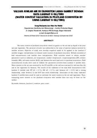 Ekosistem lahan gambut menyimpan air dalam bentuk gas di udara, dan cair dalam tanah gambut dan vegetasi. Keberadaannya mempengaruhi nilai spektral radians yang diterima oleh sensor satelit. Tujuan penelitian ini adalah untuk mendapatkan model empirik yang dapat diaplikasikan untuk interpretasi citra satelit dalam pendugaan jumlah air di ekosistem lahan gambut. Metode penelitian terdiri dari pengukuran lapangan dan interpretasi data satelit LANDSAT 8. Parameter cuaca seperti radiasi, suhu udara, suhu permukaan, evapotranspirasi (ET), kelembaban udara (RH), kadar air tanah (KAT) dan biomassa diukur di lapangan pada setiap jenis tutupan lahan. Hasil-hasil pengukuran lapangan digunakan untuk memvalidasi parameter-parameter yang diturunkan dari data satelit LANDSAT 8. Jumlah air di udara yang dinilai dari ET dan RH, jumlah air di tanah dinilai dengan laju pemanasan tanah (G) dan jumlah air di vegetasi dengan biomassa. Hasil validasi antara data lapangan dengan data LANDSAT 8 menunjukkan hanya nilai ET (r2=0,71), RH (r2=0,71), dan biomassa ((r2=0,87) mempunyai hubungan yang kuat, sedangkan nilai G tidak mempunyai hubungan yang kuat dengan KAT. Penelitian ini menyimpulkan bahwa data satelit LANDSAT 8 hanya dapat digunakan untuk menghitung jumlah air yang tersimpan di udara dan vegetasi. Oleh karena itu, pendugaan jumlah air di ekosistem lahan gambut dengan data satelit hanya dapat dilakukan di atas permukaan