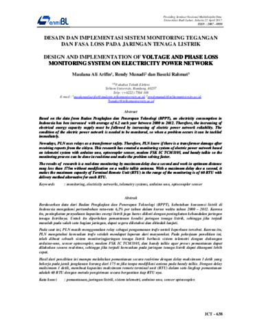 Pada saat ini, PLN masih menggunakan relay sebagai pengamanan trafo untuk keperluan tersebut. Karena itu, PLN mengetahui kerusakan trafo setelah mendapat laporan dari masyarakat. Pada pekerjaan penelitian ini, telah dibuat sebuah sistem monitoringjaringan tenaga listrik berbasis sistem telemetri dengan dukungan arduino-uno, sensor optocoupler, modem FSK IC TCM3105, dan handy talkie agar proses pemantauan dapat dilakukan secara real-time, sehingga jika terjadi kerusakan pada jaringan tenaga listrik dapat ditangani lebih cepat.