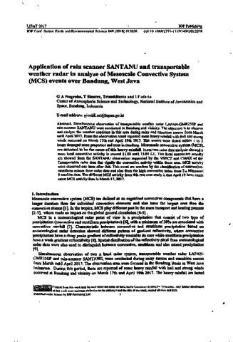 Ginaldi Ari Nugroho and Tiin Sinatra and Trismidianto and I Fitrio (2017) Application of Rain Scanner SANTANU and Transportable Weather Radar in Analyze of Mesoscale Convective System (MCS) Events Over Bandung, West ,Java. LISAT 2017. IOP Conf. Series: Earth and Environmental Science 149 (2018) 012058. pp. 1-9.