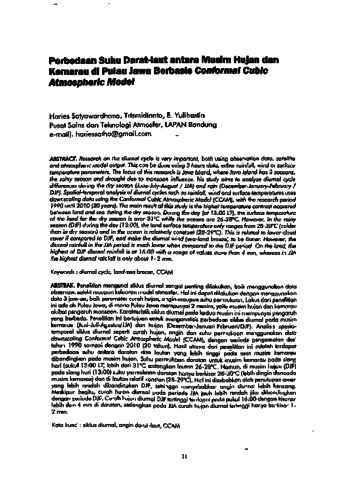 Penelitian mengenai siklus diurnal sangat penting dilakukan, baik menggunakan data observasi, satelit maupun keluaran model atmosfer. Hal ini dapat dilakukan dengan menggunakan data 3 jam-an, balk parameter curah hujan, angin maupun suhu permukaan. Lokus dari penelitian ini adalah Pulau Jawa, di mana Pulau Jawa mempunyai 2 musim, yaitu musim hujan dan kemarau akibat pengaruh monsoon. Karakteristik siklus diurnal pada kedua musim ini mempunyai pengaruh yang berbeda. Penelitian ini bertujuan untuk menganalisis perbedaan siklus diurnal pada musim kemarau (Juni-Juli-Agustus/JJA) dan hujan (Desember-Januari-Februari/DJF). Analisis spasio-temporal siklus diurnal seperti curah hujan, angin clan suhu permukaan menggunakan data downscaling Conformal Cubic Atmospheric Model (CCAM), dengan periode pengamatan dari tahun 1990 sampai dengan 2010 (20 tahun). Hasil utama dari penelitian ini adalah terdapat perbedaan suhu antara daratan dan lautan yang lebih tinggi pada saat musim kemarau dibandingkan pada musim hujan. Suhu permukaan daratan untuk musim kemarau pada siang hari (pukul 13:00 LT) lebih dari 31°C sedangkan lautan 26-28°C. Namun, di musim hujan (DJF) pada siang hari (13:00) suhu permukaan daratan hanya berkisar 28-30°C (lebih dingin daripada musim kemarau) dan di lautan relatif konstan (28-29°C). Hal ini disebabkan oleh penutupan awan yang lebih rendah dibandingkan DJF, sehingga menyebabkan angin diurnal lebih kencang. Meskipun begitu, curah hujan diurnal pada periode JJA jauh lebih rendah jika dibandingkan dengan periode DJF. Curah hujan diurnal DJF tertinggi terdapat pada pukul 16:00 dengan kisaran lebih dari 4 mm di daratan, sedangkan pada JJA curah hujan diurnal tertinggi hanya berkisar 1-2 mm.