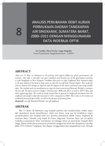 Ada 15 danau di Indonesia yang menjadi prioritas dan membutuhkan tindak lanjut dari pemerintah untuk pemulihannya. Salah satu danau yang saat ini kondisinya sangat memprihatinkan dan menjadi salah satu prioritas pemerintah adalah Danau Singkarak di Sumatera Barat. Masalah yang terjadi di Danau Singkarak, Sumatera Barat saat ini adalah rendahnya kemampuan lahan menyimpan air sehingga aliran air permukaan menjadi lebih tinggi. Kajian ini bertujuan memantau perubahan penggunaan lahan dan dampaknya terhadap debit DTA (Daerah Tangkapan Air) dengan menggunakan data penginderaan jauh. Metode yang digunakan adalah klasifikasi penutup lahan untuk memetakan penutup lahan dan Metode Rasional untuk menghitung besarnya aliran permukaan. Data yang digunakan adalah tahun 2000 Landsat TM dan 2011 data SPOT serta data pendukung lainnya. Dari hasil kajian diperoleh bahwa di DTA Singkarak pada umumnya koefisien aliran permukaan relatif meningkat pada tahun 2011 dibandingkan dengan tahun 2000. Ini disebabkan adanya peningkatan penutup lahan permukiman dan lahan terbuka, serta adanya penurunan luasan hutan primer