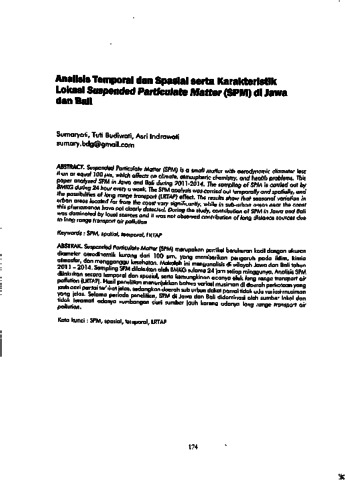 Suspended Particulate Matter (SPM) merupakan partikel berukuran kecil dengan ukuran diameter aerodinamik kurang dari 100 pm, yang memberikan pengaruh pada iklim, kimia atmosfer, dan mengganggu kesehatan. Makalah ini menganalisis di wilayah Jawa dan Bali tahun 2011 — 2014. Sampling SPM dilakukan oleh BMKG selama 24 jam setiap minggunya. Analisis SPM dilakukan secara temporal dan spasial, serta kemungkinan adanya efek long range transport air pollution (LRTAP). Hasil penelitian menunjukkan bahwa variasi musiman di daerah perkotaan yang jauh dari pantai terlihat jelas, sedangkan daerah sub urban dekat pantai tidak ada variasi musiman yang jelas. Selama periode penelitian, SPM di Jawa dan Bali didominasi oleh sumber lokal dan tidak teramati adanya sumbangan dad sumber jauh karena adanya long range transport air pollution.