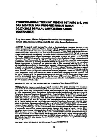 Studi ini utomanya membahas pengaruh perubahan iklim global terhadap trend perubahan awal musim di Benua Maritim Indonesia (BMI), khususnya di Pulau Jawa. Berbasis beberapa data indeks iklim global terkini yang masing-masing diwakili oleh data indeks SST (Sea Surface Temperature) Nino 3.4, DMI (Dipole Mode Index), dan Monsun, dilakukanlah prediksi anomali curah hujan yang terjadi di Pulau Jawa, khususnya Yogyakarta. Data curah hujan Yogyakarta diperoleh dari Climate Hazards Group InfraRed Precipitation with Station (CHIRPS) rata-rata bulanan selama 34 tahun pengamatan (1981-2014). Sesuai dengan prediksi yang telah dilakukan oleh pihak POAMA (Predictive Ocean Atmosphere Model for Australia), SST Nino 3.4 dan DMI akan berada di sekitar posisi nomal (neutral) hingga Juni 2018. Dengan asumsi anomali curah hujan yang terjadi di Yogyakarta dipengaruhi oleh dua utama indeks global di atas, diduga anomali curah hujan yang terjadi di Yogyakarta akan didominasi oleh faktor Monsun. Dengan kata lain, faktor Monsunlah yang akan mendominasi mempengaruhi anomali curah hujan di Yogyakarta hingga Juni 2018. Hasil onalisis data indeks Monsun terhadap anomali curah hujan di Yogyakarta menunjukkan bahwa puncak Musim Kemarau (MK) terjadi di sekitar Agustus 2017. Sementara Musim Transisi (MT) diperkirakan dimulai sekitar September, Oktober dan November (SON) 2017. Sementara Musim Hujan (MH) dimulai sekitar awal Desember 2017 dan terus berlanjut hingga akhir Februari 2018. Musim transisi kedua diduga akan jatuh pada period e Maret, April dan Mei (MAM) 2018, sebelum okhirnya masuk ke MK di owal Juni 2018. Seluruh rangkaian di atas terjadi, bila kondisi SST Nino 3.4 dan DMI tetap berada di posisi "sekitar" normal, dan Monsun merupakan satu-satunya faktor yang dominan.