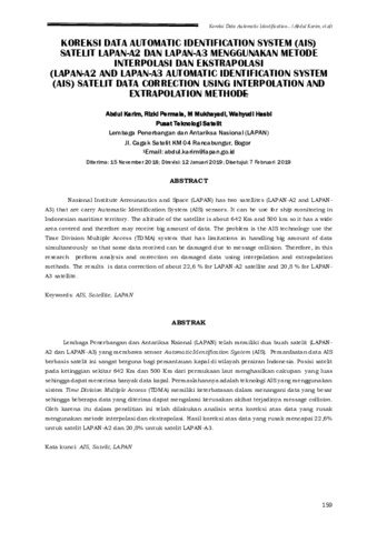 Lembaga Penerbangan dan Antariksa Naional (LAPAN) telah memiliki dua buah satelit (LAPAN A2 dan LAPAN-A3) yang membawa sensor Automatic Identification System (AIS). Pemanfaatan data AIS berbasis satelit ini sangat berguna bagi pemantauan kapal di wilayah perairan Indonesia. Posisi satelit pada ketinggian sekitar 642 Km dan 500 Km dari permukaan laut menghasilkan cakupan yang luas sehingga dapat menerima banyak data kapal. Permaslahannya adalah teknologi AIS yang menggunakan sistem Time Division Multiple Access (TDMA) memiliki keterbatasan dalam menangani data yang besar sehingga beberapa data yang diterima dapat mengalami kerusakan akibat terjadinya message collision. Oleh karena itu dalam penelitian ini telah dilakukan analisis serta koreksi atas data yang rusak mengunakan metode interpolasi dan ekstrapolasi. Hasil koreksi atas data yang rusak mencapai 22,6% untuk satelit LAPAN-A2 dan 20,8% untuk satelit LAPAN-A3.