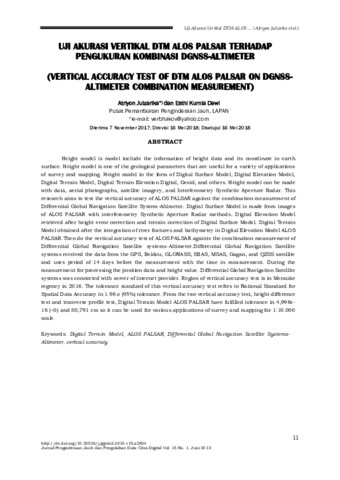 Model tinggi adalah model yang meliputi informasi data tinggi dan koordinatnya di permukaan bumi. Model tinggi merupakan salah satu parameter geologi yang bermanfaat untuk berbagai aplikasi survei dan pemetaan. Model tinggi berupa model permukaan digital, model elevasi digital, model terrain digital, model terrain elevasi digital, Geoid, dan lain-lain. Model tinggi dapat dibuat dengan data lapangan, foto udara, interferometri radar sintetis, dan citra satelit. Penelitian ini bertujuan untuk melakukan uji akurasi vertikal model terrain digital ALOS PALSAR terhadap pengukuran kombinasi diferensial sistem satelit navigasi global-Altimeter. Model permukaan digital dibuat dari citra ALOS PALSAR dengan metode interferometri radar sintetis. Model elevasi digital diperoleh setelah dilakukan koreksi kesalahan tinggi dan koreksi terrain model permukaan digital. Model terrain digital diperoleh setelah dilakukan integrasi fitur sungai dan batimetri terhadap model permukaan digital. Model terrain digital ALOS PALSAR dilakukan uji akurasi vertikal dengan pengukuran kombinasi diferensial sistem satelit navigasi global-Altimeter. Diferensial sistem satelit navigasi global menerima data dari satelit GPS, Glonass, Beidou, Gagan, MSAS, SBAS, dan QZSS dan menggunakan periode waktu 14 hari sebelum pengukuran dengan waktu saat pengukuran. Selama pengukuran,untuk mengolah data posisi dan ketinggian. Diferensial sistem satelit navigasi global dikoneksikan dengan server melalui jaringan internet selular. Lokasi uji akurasi vertikal dilakukan di Kabupaten Merauke pada tahun 2016. Standar toleransi uji akurasi vertikal ini mengacu kepada toleransi standar nasional untuk akurasi data spasial sebesar 1,96σ (95 %). Dari dua jenis uji akurasi vertikal, yakni uji beda tinggi dan uji profil melintang, model terrain digital ALOS PALSAR telah memenuhi toleransi sebesar 4,996e-16 (~0)dan 80,791 cm sehinggadapat digunakan untuk berbagai aplikasi survei dan pemetaan skala 1:10.000.