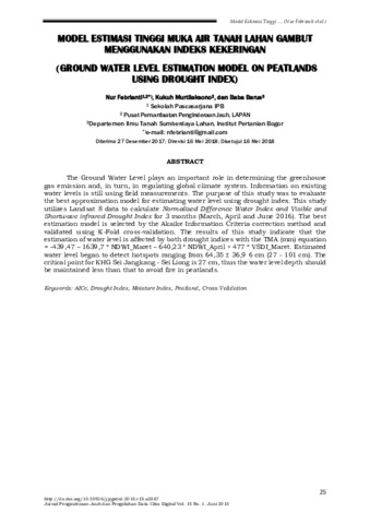 Tinggi muka air tanah lahan gambut atau secara teknis dikenal dengan kedalaman muka air tanah memegang peran penting dalam menentukan emisi gas rumah kaca dan mengatur sistem iklim global. Informasi tentang tinggi muka air yang ada saat ini masih menggunakan hasil pengukuran lapangan. Tujuan penelitian ini adalah mengevaluasi model aproksimasi terbaik untuk estimasi tinggi muka air dengan menggunakan indeks kekeringan. Penelitian ini memanfaatkan data Landsat 8 untuk menghitung Normalized Difference Water Index dan Visible and Shortwave infrared Drought Index selama 3 bulan (Maret, April dan Juni 2016). Model estimasi terbaik dipilih dengan metode koreksi Kriteria Informasi Akaike dan divalidasi menggunakan validasi silang K-Fold. Hasil penelitian ini menunjukkan bahwa estimasi tinggi muka air dipengaruhi oleh kedua indeks kekeringan tersebut dengan persamaan TMA (mm) = - 439,47 – 1639,7 * NDWI_Maret – 640,23 * NDWI_April + 477 * VSDI_Maret. Estimasi tinggi muka air mulai terdeteksi adanya hotspot berkisar antara 64,35±36,9 6 cm (27 – 101 cm). Titik kritis untuk KHG Sei Jangkang – Sei Liong adalah 27 cm, dengan demikian kedalaman tinggi muka air harus dipertahankan kurang dari itu untuk menghindari terjadinya kebakaran di lahan gambut