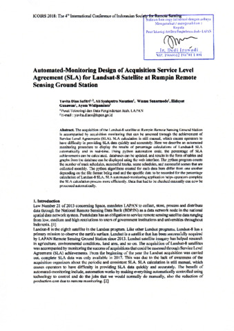 Yuvita Dian Safitri and Ali Syahputra Nasution and Wismu Sunarmodo and Hidayat Gunawan and Ayom Widipaminto (2018) Automated-Monitoring Design of Acquisition Service Level Agreement (SLA) for Landsat-8 Satellite at Rumpin Remote Sensing Ground Station. In: The 4th International Conference of Indonesian Society for Remote Sensing (ICOIRS) 2018, 30 October 2018, Makassar, Indonesia.
