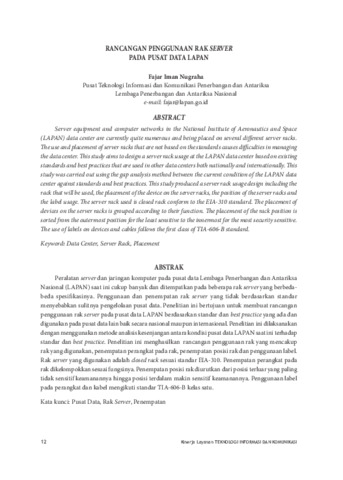 Peralatan server dan jaringan komputer pada pusat data Lembaga Penerbangan dan Antariksa Nasional (LAPAN) saat ini cukup banyak dan ditempatkan pada beberapa rak server yang berbeda beda spesifikasinya. Penggunaan dan penempatan rak server yang tidak berdasarkan standar menyebabkan sulitnya pengelolaan pusat data. Penelitian ini bertujuan untuk membuat rancangan penggunaan rak server pada pusat data LAPAN berdasarkan standar dan best practice yang ada dan digunakan pada pusat data lain baik secara nasional maupun internasional. Penelitian ini dilaksanakan dengan menggunakan metode analisis kesenjangan antara kondisi pusat data LAPAN saat ini terhadap standar dan best practice. Penelitian ini menghasilkan rancangan penggunaan rak yang mencakup rak yang digunakan, penempatan perangkat pada rak, penempatan posisi rak dan penggunaan label. Rak server yang digunakan adalah closed rack sesuai standar EIA-310. Penempatan perangkat pada rak dikelompokkan sesuai fungsinya. Penempatan posisi rak diurutkan dari posisi terluar yang paling tidak sensitif keamanannya hingga posisi terdalam makin sensitif keamanannya. Penggunaan label pada perangkat dan kabel mengikuti standar TIA-606-B kelas satu.