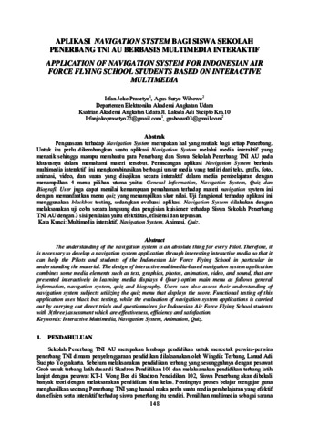 Penguasaan terhadap Navigation System merupakan hal yang mutlak bagi setiap Penerbang. Untuk itu perlu dikembangkan suatu aplikasi Navigation System melalui media interaktif yang menarik sehingga mampu membantu para Penerbang dan Siswa Sekolah Penerbang TNI AU pada khususnya dalam memahami materi tersebut. Perancangan aplikasi Navigation System berbasis multimedia interaktif ini mengkombinasikan berbagai unsur media yang terdiri dari teks, grafis, foto, animasi, video, dan suara yang disajikan secara interaktif dalam media pembelajaran dengan menampilkan 4 menu pilihan utama yaitu: General Information, Navigation System, Quiz dan Biografi. User juga dapat menilai kemampuan pemahaman terhadap materi navigation system ini dengan memanfaatkan menu quiz yang menampilkan skor nilai. Uji fungsional terhadap aplikasi ini menggunakan blackbox testing, sedangkan evaluasi aplikasi Navigation System dilakukan dengan melaksanakan uji coba secara langsung dan pengisian kuisioner terhadap Siswa Sekolah Penerbang TNI AU dengan 3 sisi penilaian yaitu efektifitas, efisiensi dan kepuasan.