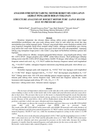 Kenaikan temperatur dan tekanan dalam tabung akibat proses pembakaran roket dapat menimbulkan pembebanan atau gaya pada tabung motor roket ke arah radial dan aksial dan juga menimbulkan gaya akibat tegangan panas. Tekanan yang terjadi dalam motor disalurkan melalui nosel yang fungsinya mengubah energi tekan menjadi energi kinetis, sehingga menimbulkan gaya dorong yang keluar dari nosel roket. Karena adanya gaya-gaya aksial maka akan ada perpindahan sepanjang tabung yang merupakan fungsi posisi x dan waktu t yang dapat meNyebabkan timbulnya getaran dan tegangan. Dalam tulisan ini dibahas mengenai pengaruh beban tekanan yang terjadi pada tabung roket RX 1220 LAPAN dengan propelan jenis HTPB akibat beban tekanan. Hasil perhitungan terhadap tabung motor roket RX 1220 LAPAN dengan bahan AL6061 T6 dengan tebal tabung 3.65 mm didapat frequensi natural arah axial n1 = 31,746.97 rad/det dan besarnya frequensi natural arah longitudinal