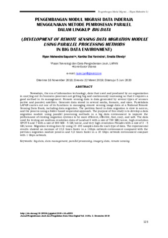 Era teknologi informasi sekarang ini, data yang digunakan dan dihasilkan oleh suatu organisasi dalam menjalankan proses bisnisnya semakin besar dan terus meningkat sehingga membutuhkan metode yang baik dalam pengelolaannya. Data penginderaan jauh merupakan data yang dihasilkan dari beberapa jenis sensor satelit aktif maupun pasif. Data tersebut disimpan dalam beragam media, format dan ukuran. Pustekdata LAPAN melakukan pengelolaan seluruh data citra penginderaan jauh yang dimilikinya di sistem Bank Data Penginderaan Jauh Nasional, termasuk migrasi data. Permasalahan yang dihadapi dalam migrasi data adalah akses yang lambat, terutama karena prosesnya masih menggunakan pendekatan sekuensial berbasis folder. Tujuan penelitian ini adalah mengembangkan modul migrasi data menggunakan metode pemrosesan paralel dalam lingkup big data untuk meningkatkan performa sistem migrasi yang ada menjadi lebih efisien, efektif, cepat, mudah dan aman. Pada pengujian ini digunakan data resolusi menengah Landsat 8 dengan ukuran 780 MB/scene, resolusi tinggi SOPT 6 dan 7 dengan ukuran 300 MB – 5 GB/scene dan resolusi sangat tinggi Pleiades dengan ukuran 2-5 GB/scene. Pengujian dilakukan dengan meggunakan 10-100 data sampel untuk setiap jenis data. Hasil percobaan menunjukkan peningkatan kecepatan 12,8 kali lebih cepat dari modul migrasi sebelumnya di lingkungan jaringan 1 Gbps dan 4,8 kali lebih cepat dalam lingkungan jaringan 10 Gbps dibandingkan 1 Gbps