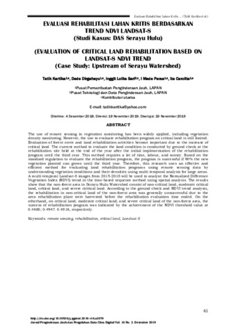 Pemanfaatan penginderaan jauh dalam memantau vegetasi sudah banyak dilakukan, termasuk monitoring kerapatan vegetasi. Tetapi, pemanfaatannya untuk mengevaluasi rehabilitasi di lahan kritis masih sangat terbatas. Kegiatan rehabilitasi hutan dan lahan menjadi penting dengan meningkatnya lahan kritis. Metode evaluasi saat ini dilakukan dengan mendatangi lokasi rehabilitasi secara langsung untuk memantau pertumbuhan tanaman pada setiap akhir tahun setelah awal tanam, sampai akhir tahun ketiga. Metode ini memakan waktu, tenaga, dan biaya yang mahal. Berdasarkan peraturan dan standar rehabilitasi untuk mengevaluasi program, keberhasilan program tercapai apabila 90% vegetasi yang ditanam bisa tumbuh sampai akhir tahun ketiga. Pada penelitian ini, evaluasi kegiatan rehabilitasi lahan dapat dilakukan secara efektif dan efisien dengan memanfaatkan data penginderaan jauh dengan memahami kondisi vegetasi atau kerapatannya menggunakan analisis multi-temporal dengan cakupan luas. Data penginderaan jauh yang digunakan adalah Landsat-8 tahun 2015-2018 dengan menganalisis Normalized Difference Vegetation Index (NDVI) dari waktu ke waktu berbasis analisis spasial. Hasilnya adalah bahwa kawasan Area Penggunaan Lain (APL) di DAS Serayu Hulu terdapat lokasi rehabilitasi di lahan tidak kritis (TK), agak kritis (AK), kritis (K), dan sangat kritis (SK). Berdasarkan hasil survei lapangan dan analisis trend NDVI, rehabilitasi pada APL di lahan TK (APL_TK) umumnya tidak berhasil karena sudah dilakukan penebangan sebelum waktu penilaian rehabilitasi berakhir. Sementara itu, pada APL_K; APL_AK; dan APL_SK keberhasilan program rehabilitasi tercapai dengan ditunjukkan oleh batas bawah nilai NDVI berturut-turut melampaui nilai 0,4660; 0,4947; dan 0,4916