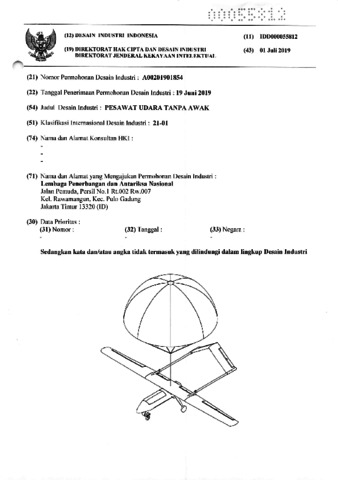 Pemberian Hak Desain Industri konfigurasi Pesawat Udara tanpa Awak dari Direktorat Hak Cipta dan Desain Industri,Direktorat Jenderal Kekayaan Intelektual, Kementerian Hukum dan Hak Asasi Manusia kepada LAPAN