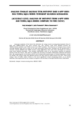 Telah dilakukan sebuah analisis akurasi deteksi kebakaran hutan dengan data hotspot dari satelit penginderaan jauh S-NPP dan TERRA/AQUA. Sensor yang digunakan yaitu Sensor MODIS untuk satelit TERRA/AQUA dan sensor VIIRS untuk satelit S-NPP. Pendeteksian kebakaran hutan dengan titik panas dari data satelit penginderaan jauh dapat digunakan sebagai peringatan dini kebakaran hutan. Titik panas dapat diturunkan dari 2 sensor yang ada disatelit yaitu sensor MODIS dan VIIRS dengan menggunakan algoritma yang telah dikembangkan. Nilai hotspot ini perlu dilakukan analisis akurasi dengan membandingkan dengan data lapangan mengenai kejadian kebakaran. Penelitian ini bertujuan untuk melakukan analisis tingkat akurasi hotspot dalam mendeteksi kebakaran hutan. Dengan membandingkan data kejadian kebakaran pada tahun 2017 dan 2018 dan data informasi titik panas pada database titik panas yang dimiliki LAPAN. Hasil akurasi menunjukan untuk sensor MODIS sebesar 45% dan untuk sensor VIIRS sebesar 23%, dengan hasil ini jelas menunjukkan bahwa perlu dilakukan perbaikan untuk meningkatkan akurasi pada informasi titik panas terutama yang diturunkan dari data VIIRS.