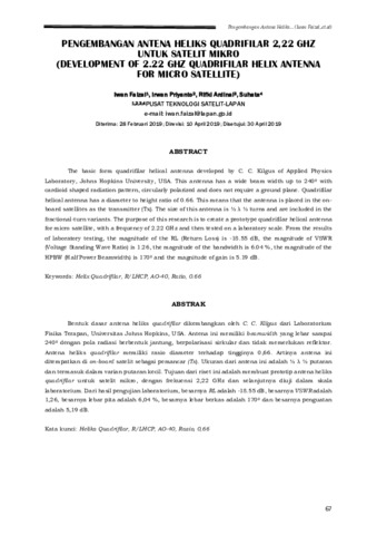 Iwan Faizal and Irwan Priyanto and Rifki Ardinal and Suhata (2019) Pengembangan Antena Heliks Quadrifilar 2,22 GHZ Untuk Satelit Mikro. Jurnal Teknologi Dirgantara, 17 (1). pp. 67-78. ISSN 1412-8063