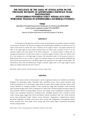 Subagyo (2019) The Influence Of The Angle Of Attack Alpha On The Pressure Recovery At Aerodynamics Interface Plane Investigation. Jurnal Teknologi Dirgantara, 17 (1). pp. 19-29. ISSN 1412-8063