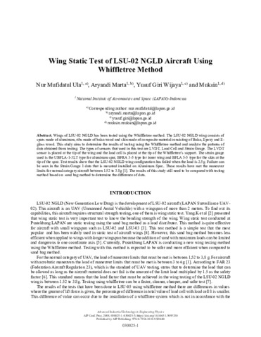 Nur Mufidatul Ula and Aryandi Marta and Yusuf Giri Wijaya and Muksin (2019) Wing Static Test of LSU-02 NGLD Aircraft using Whiffletree Method. AIP Conference Proceedings 2019, 2088. 030025-1.