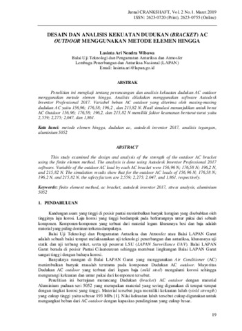 Lasinta Ari Nendra Wibawa (2019) Desain Dan Analisis Kekuatan Dudukan (Bracket) AC Outdoor Menggunakan Metode Elemen Hingga. Jurnal Crankshaft, 2 (1). pp. 19-24. ISSN 2623-0720
