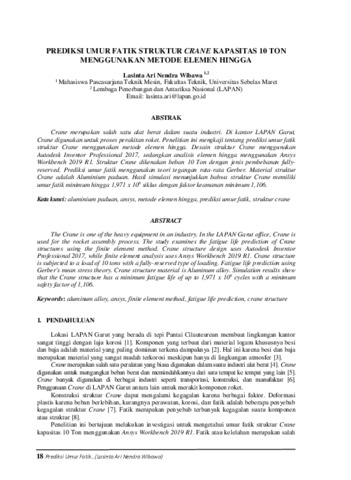 Crane merupakan salah satu alat berat dalam suatu industri. Di kantor LAPAN Garut, Crane digunakan untuk proses perakitan roket. Penelitian ini mengkaji tentang prediksi umur fatik struktur Crane menggunakan metode elemen hingga. Desain struktur Crane menggunakan Autodesk Inventor Professional 2017, sedangkan analisis elemen hingga menggunakan Ansys Workbench 2019 R1. Struktur Crane dikenakan beban 10 Ton dengan jenis pembebanan fully reserved. Prediksi umur fatik menggunakan teori tegangan rata-rata Gerber. Material struktur Crane adalah Aluminium paduan. Hasil simulasi menunjukkan bahwa struktur Crane memiliki umur fatik minimum hingga 1,971 x 106 siklus dengan faktor keamanan minimum 1,106