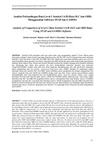 Sentinel-1A/B merupakan salah satu satelit radar yang menggunakan spektral C-band. Dalam proses akuisisinya, terdapat 4 mode akuisisi yang dapat dihasilkan yaitu, SM, IW, EW, dan WV dimana ditiap mode umumnya memiliki 2 jenis data level-1 yaitu SLC dan GRD. Data SLC adalah data yang sudah dilakukan proses geo-reference yang ditampilkan dalam geometri Slant-Range sedangkan data GRD adalah data yang sudah diproyeksikan geometrinya terhadap model elipsoid bumi. Kedua data tersebut memiliki karakteristik berbeda sehingga perlu diketahui kelebihan dan kekurangan dari kedua data tersebut dan hasil hamburbalikan terkoreksi geometri dan radiometri (sigma/beta/GAMMA nought) yang lebih baik untuk keperluan pemanfaatannya atau nilai geobiofisik turunannya seperti pengambilan nilai soil moisture, Normalized Polarization Index (NDPI). Makalah ini menjelaskan tingkat kemiripan kedua data tersebut (SLC dan GRD) setelah dilakukan proses pengolahan data dengan menggunakan dua software pengolah data yaitu SNAP dan GAMMA dengan studi area Jawa Timur. Analisa yang dilakukan adalah membandingkan hasil yang diperoleh dari nilai hamburbalikan secara visual dan statistik. Secara visual, tingkat kecerahan citra dari hasil olah data pada software SNAP dan GAMMA adalah cenderung sama. Akan tetapi, tingkat kedetailan data SLC dan GRD dari pengolahan kedua software menunjukkan hasil yang berbeda. Software GAMMA menghasilkan citra data SLC yang lebih baik sementara software SNAP menghasilkan citra data GRD yang lebih baik. Kedua hal tersebut didukung oleh informasi data statistic yang ada. Hasil penelitian ini dihaeapkan dapat memberikan masukan pada proses otomatisasi pengolahan data Sentinel-1 di lingkungan Pusat Teknologi dan Data Penginderaan Jauh LAPAN.