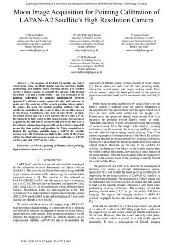 spacecraft’s attitude sensors, spacecraft axis, and cameras, to make sure the accuracy of the camera pointing when capture the image. By using the inertial pointing method, that the satellite is controlled in three axis to direct the satellite camera to the Moon. Nevertheless, the field of view (FOV) of highresolution digital cameras is very narrow, which is only 0.7° for the Moon to be fully visible in the camera frame. During image acquisition, the star sensor should be still able to see the star so the attitude information of spacecraft can be well determined. It means the time period and position for Moon acquisition is limited. By capturing multiple images, LAPAN-A2 satellite success to get the Moon images right in the center of the frame within the offset between camera and spacecraft axis are 0.1232° on the x axis and -0.93° on the y axis