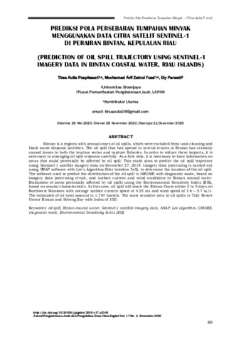 Bintan merupakan wilayah dengan kasus tumpahan minyak yang terjadi di setiap tahunnya, diduga berasal dari aktivitas tank cleaning dan pembuangan limbah hitam. Tumpahan minyak yang telah menyebar ke beberapa resort di Bintan menyebabkan kerugian baik di sektor pariwisata maupun perikanan tangkap. Untuk mengurangi dampak kerugian, perlu dilakukan upaya penanggulangan yang matang. Sebagai langkah awal, informasi mengenai daerah yang berpotensi untuk terkena dampak tumpahan minyak sangat diperlukan. Penelitian ini bertujuan memprediksi pola sebaran minyak menggunakan data citra satelit Sentinel-1 pada tanggal 27 Desember 2019. Pengolahan data citra dilakukan menggunakan perangkat lunak SNAP dengan filter Algoritma Lee (window 5x5), untuk mengetahui lokasi tumpahan minyak. Perangkat lunak yang digunakan dalam memprediksi sebaran minyak yaitu GNOME dengan mode diagnostik, berdasarkan hasil pengolahan citra satelit serta kondisi arus dan angin di perairan Bintan. Pendugaan daerah yang berpotensi terkena tumpahan minyak menggunakan Indeks Sensitivitas Lingkungan (ESI), berdasarkan karakteristik pantai. Pada model ini diperoleh bahwa tumpahan minyak pada Musim Utara akan mencapai wilayah pesisir Bintan dalam waktu 2 sampai 5 hari dengan kecepatan arus rata-rata 4.28 meter/detik dan kecepatan angin 3.6 – 5.7 meter/detik. Total minyak yang tumpah diperkirakan sebanyak 1.767 barel. Wilayah yang paling sensitif terhadap tumpahan minyak adalah Trily Resort Center Bintan dan Teluk Sebong dengan Indeks 10D