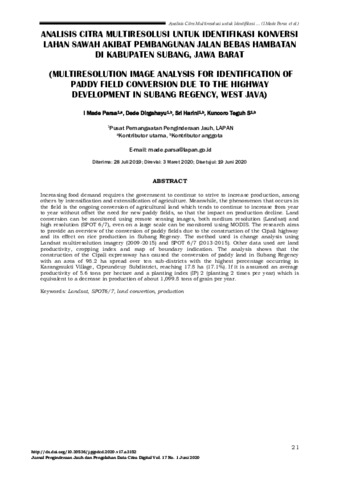 I Made Parsa and Dede Dirgahayu and Sri Harini and Kuncoro Teguh Setiawan (2020) Analisis citra multiresolusi untuk identifikasi konversi lahan sawah akibat pembangunan jalan bebas hambatan Di Kabupaten Subang, Jawa Barat. Jurnal Penginderaan Jauh dan Pengolahan Data Citra Digital, 17 (1). pp. 21-32. ISSN 1412-8098